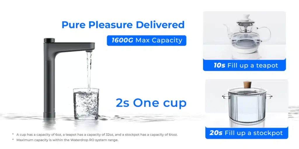 1600G Peak Capacity: Unleash the power of peak hydration with our revolutionary tankless reverse osmosis system. With a 1600G large capacity, it delivers water at an incredible rate, filling a 6oz cup within a mere 2 seconds. Embrace the convenience and health of instant RO filtration.